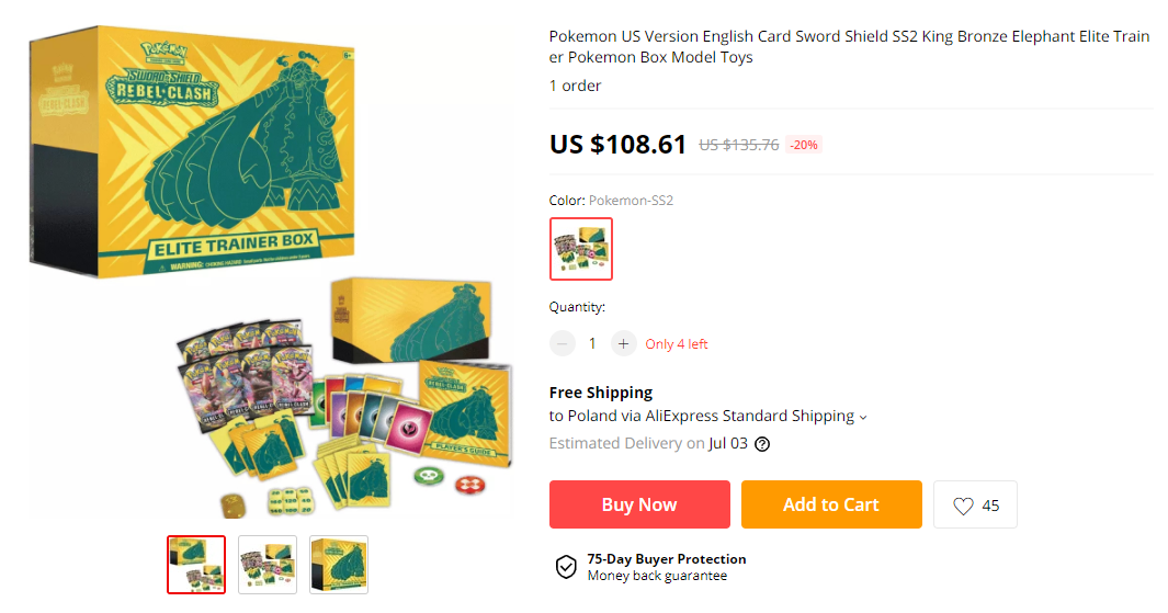 Aukcja na Aliexpress nazwana: Pokemon wersja amerykańska karta angielska miecz tarcza SS2 król brązowy słoń Elite trener Pokemon Box zabawki modele (po angielsku: Pokemon US Version English Card Sword Shield SS2 King Bronze Elephant Elite Trainer Pokemon Box Model Toys)