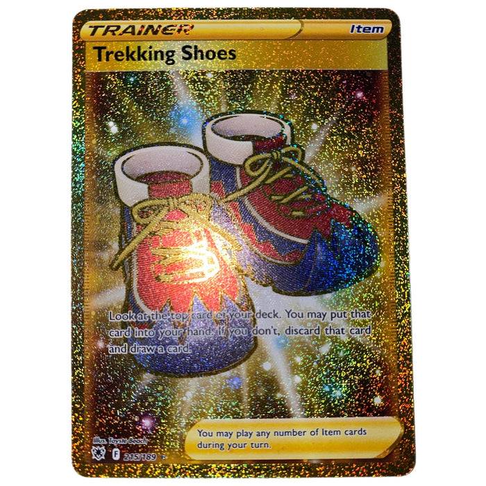 Zauważcie jak intensywnie świecą się te karty i jak wyraźnie widać piaskowy hologram (w karcie Trekking Shoes). Jak widzicie – złote karty bardzo często mają kolorowego pokemona lub przedmiot – nie są więc całkowicie złote. Oryginalne złote karty to mogą być Pokemony, ale również karty trenerskie lub energie.