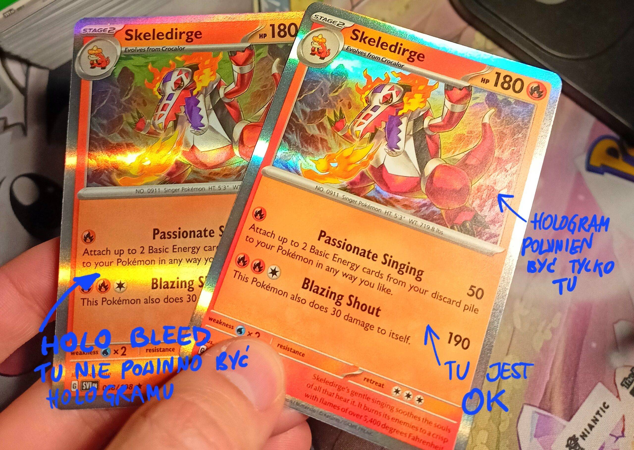 W najnowszych setach Scarlet/Violet, niektóre hologramy mogą wyglądać jak podóbki. Dzieje się to z dwóch powodów – hologram najnowszych setów jest bardzo prosty i lustrzany, przez co łatwo go podrobić, a ponadto kontrola jakości ostatnio jest bardzo słaba i niektóre brzydko wydrukowane karty przepuszcza. Najlepszym przykładem jest ten artykuł, ale dodatkowo przedstawiam wam poniżej zdjęcie dwóch oryginalnych kart, które mają tak zwany „holo bleed” – wylany hologram, który nie powinien być w tym miejscu, co widać dobrze na lewej karcie.